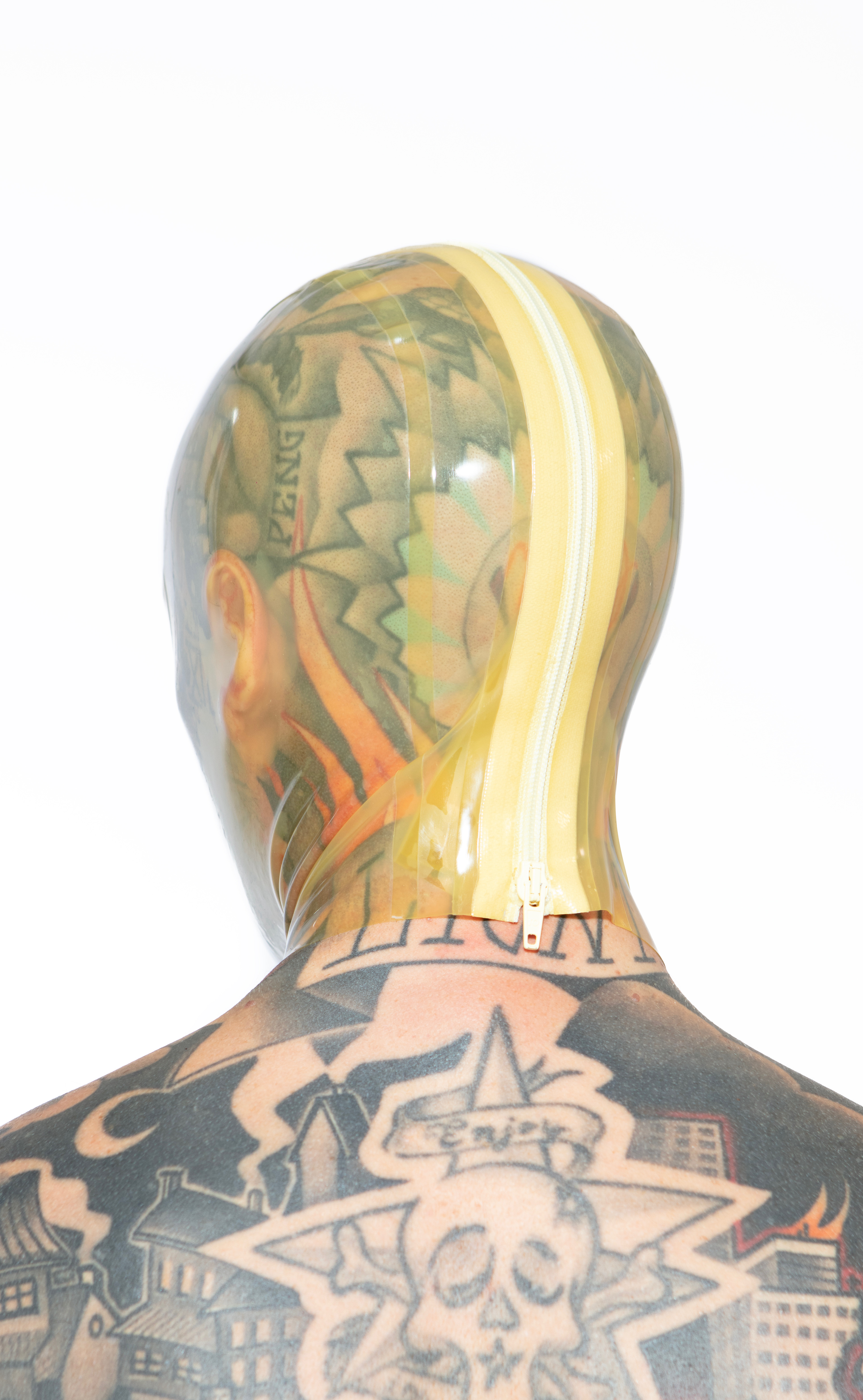 - with zipper in the back of the head, that has latex underneath, so that the hair will not get stuck in it